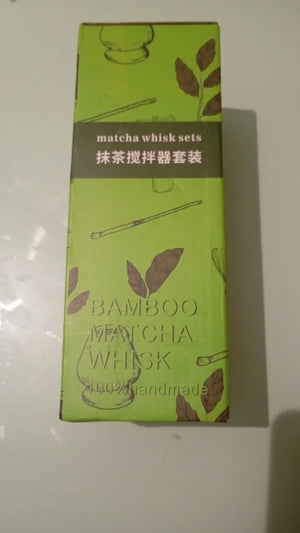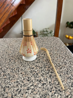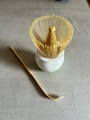 Includes bamboo chasen whisk, chashaku scoop, ceramic spoon, and porcelain fittings. Each piece is sized for daily single-cup matcha preparation and built for durability.