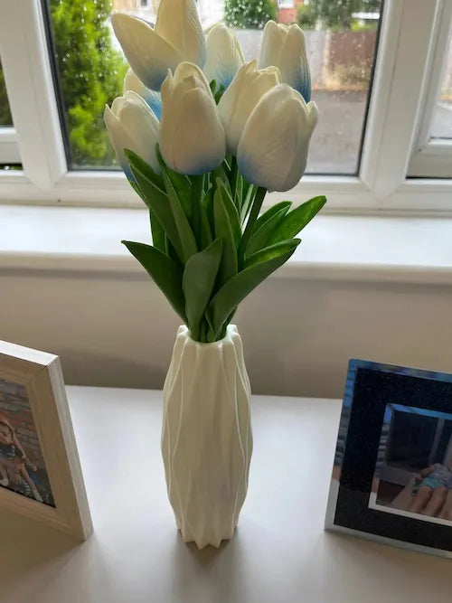 This vase is legit one of my fav decor pieces now! It's so sleek and modern. The diamond pattern is just stunning, and it really makes the flowers pop. Super safe, tooโ€”no worries about sharp edges. Iโ€™ve received so many compliments, and now my sister wants one too! ๐Ÿ˜Šโค๏ธ